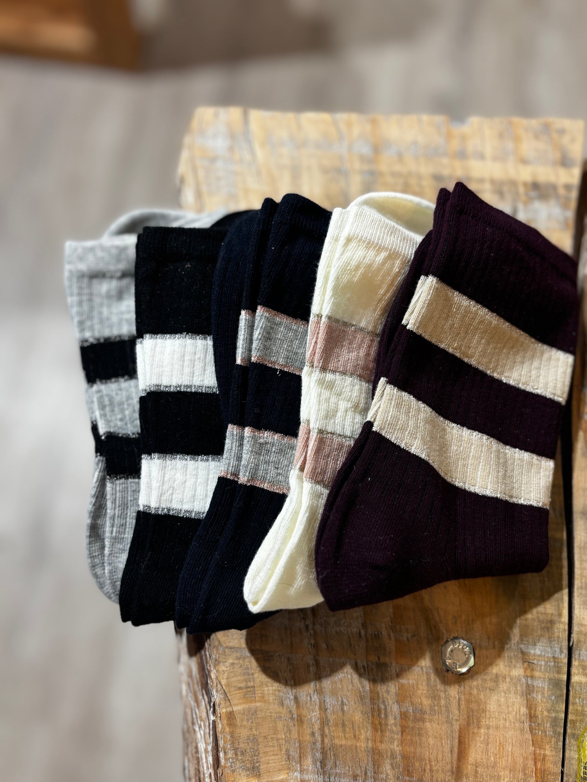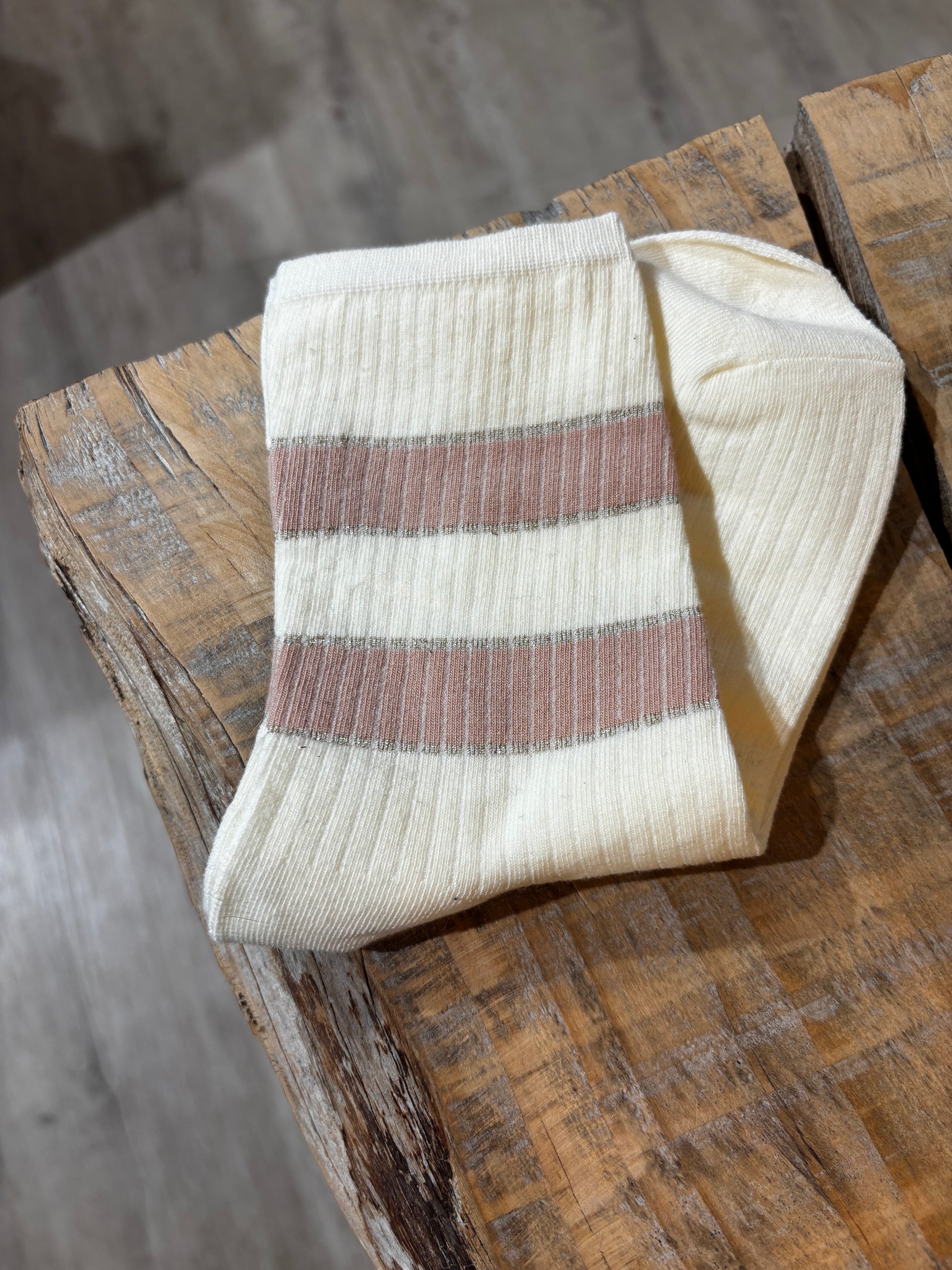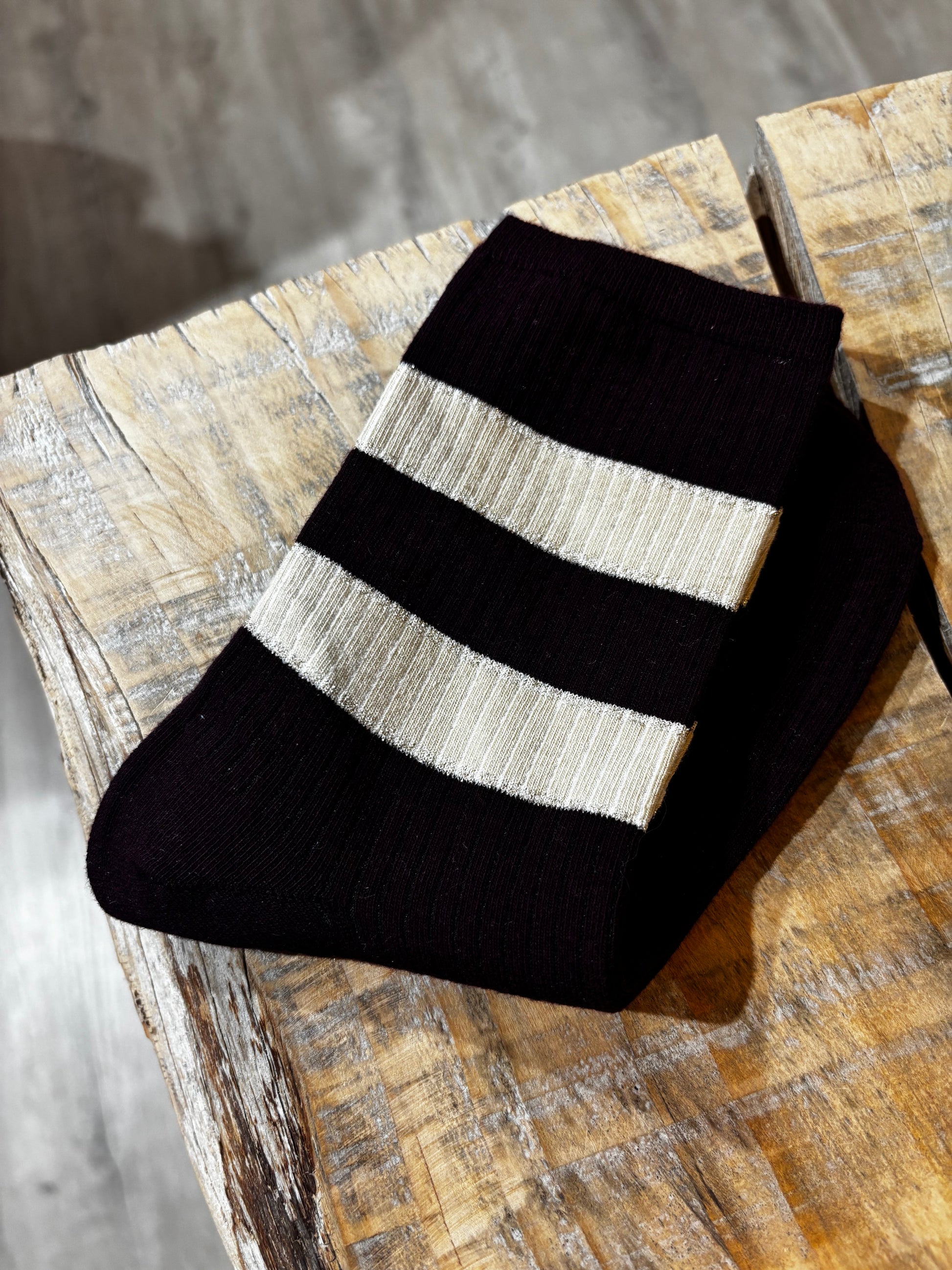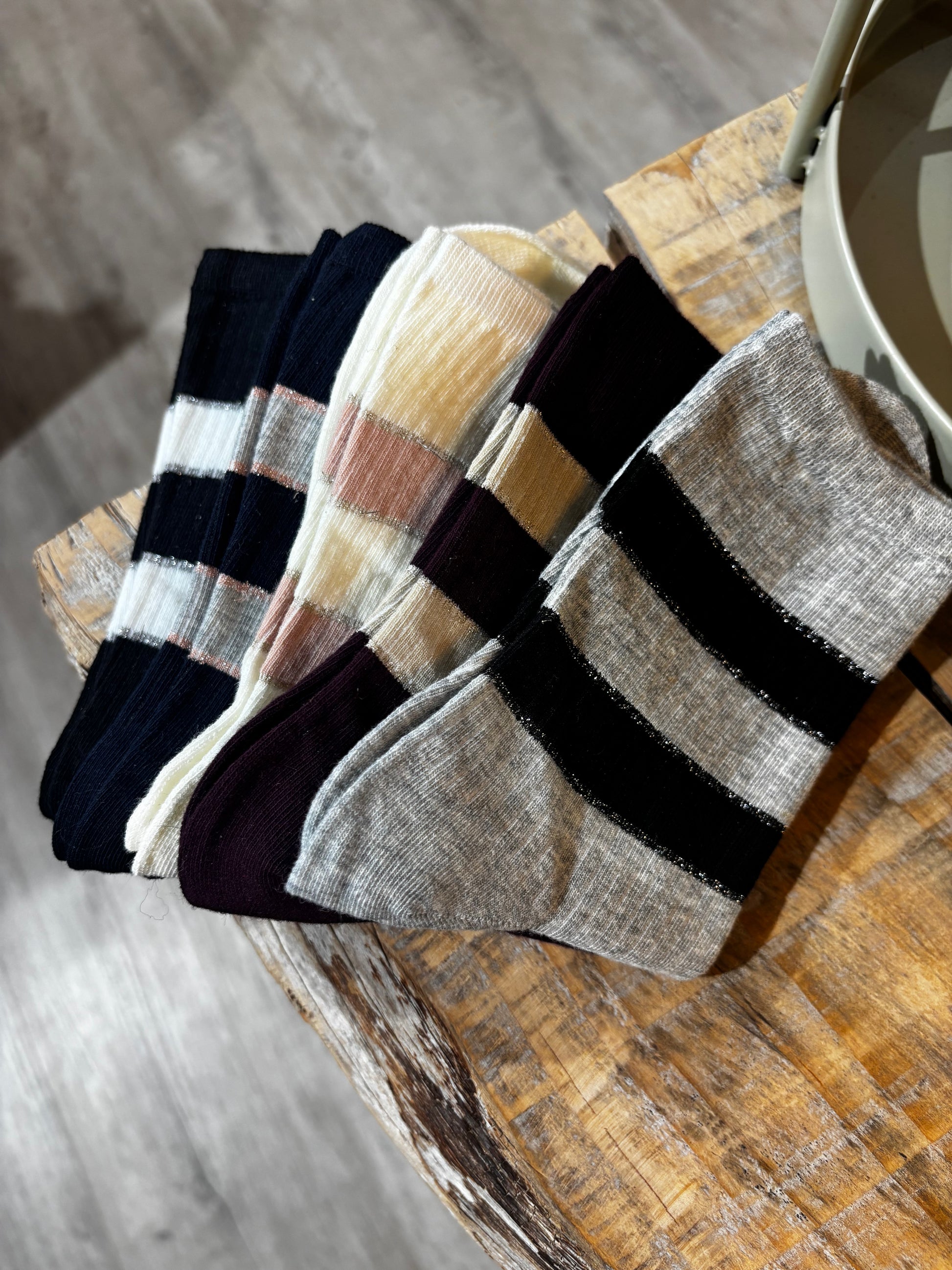 Calzini in cotone, con righe alte e lurex.