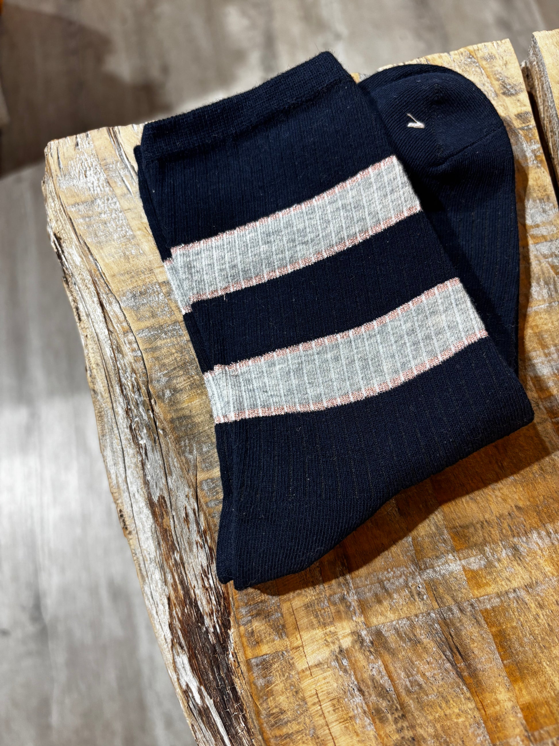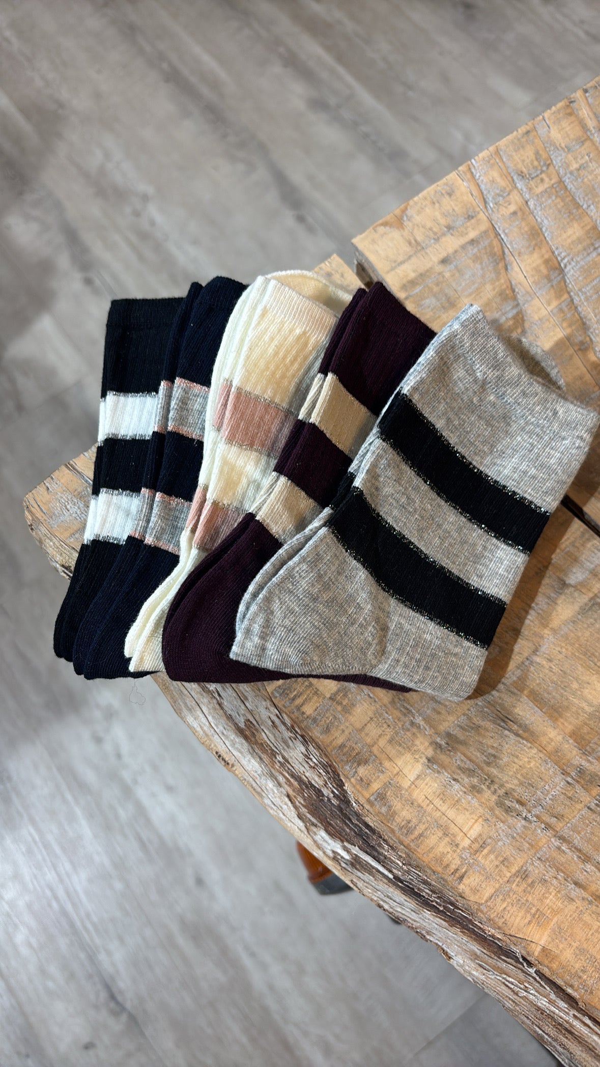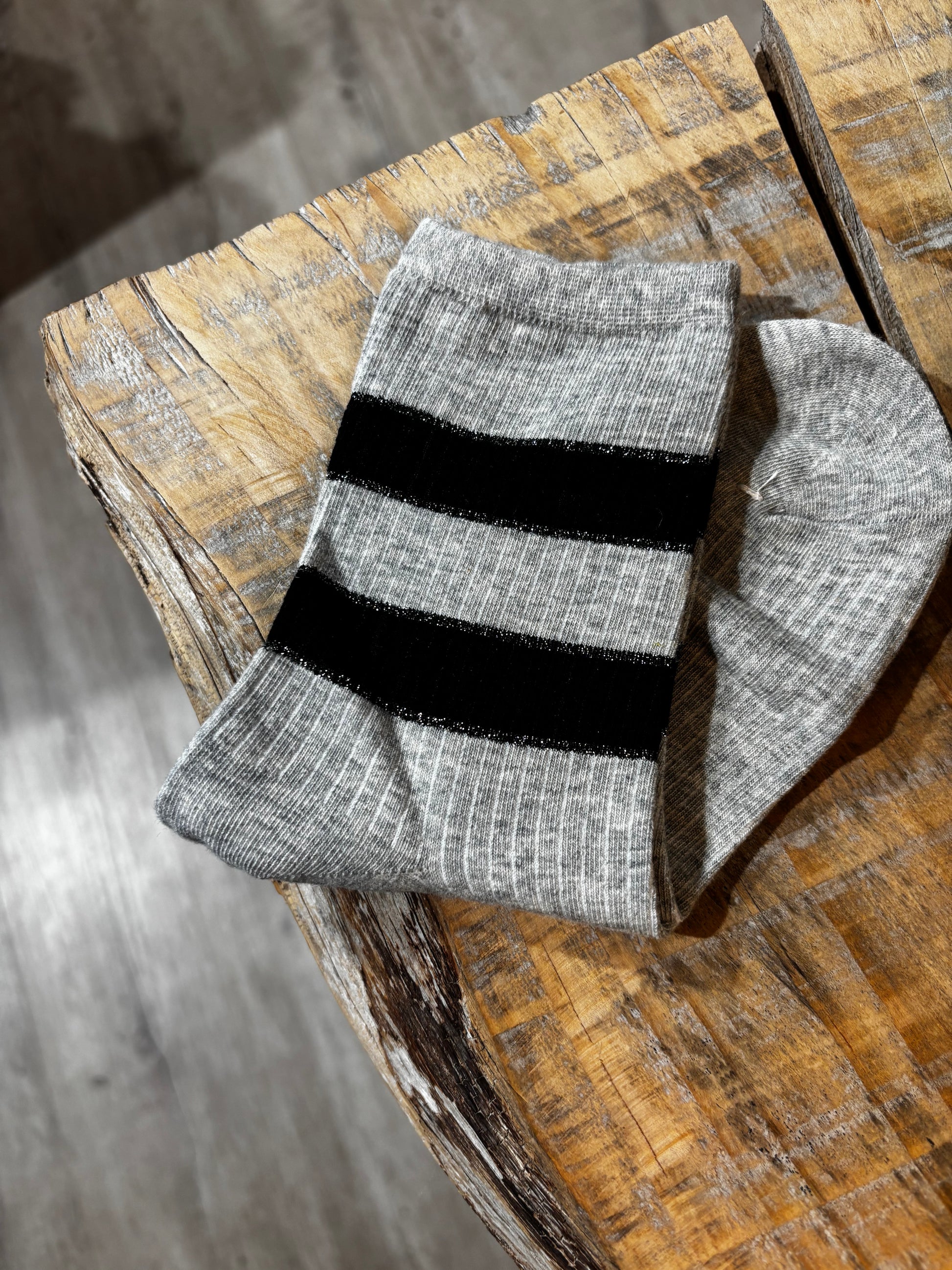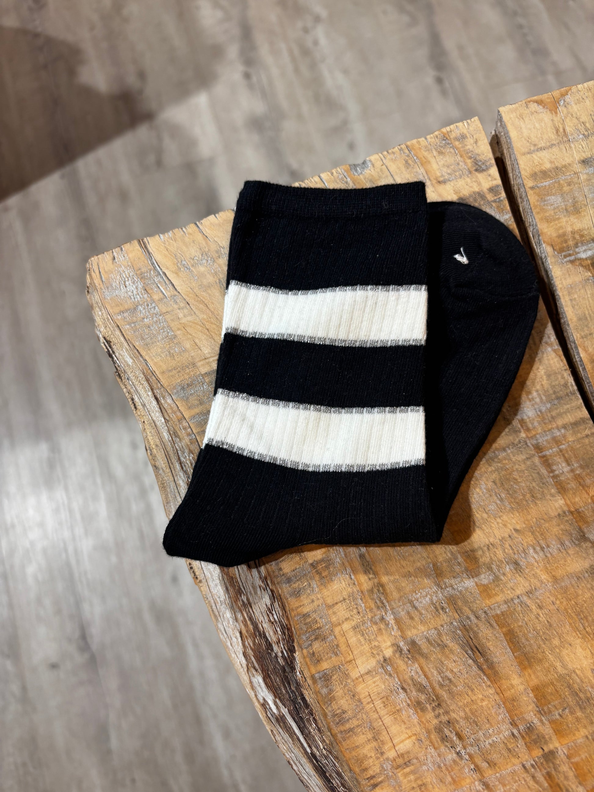 Calzini in cotone, con righe alte e lurex.