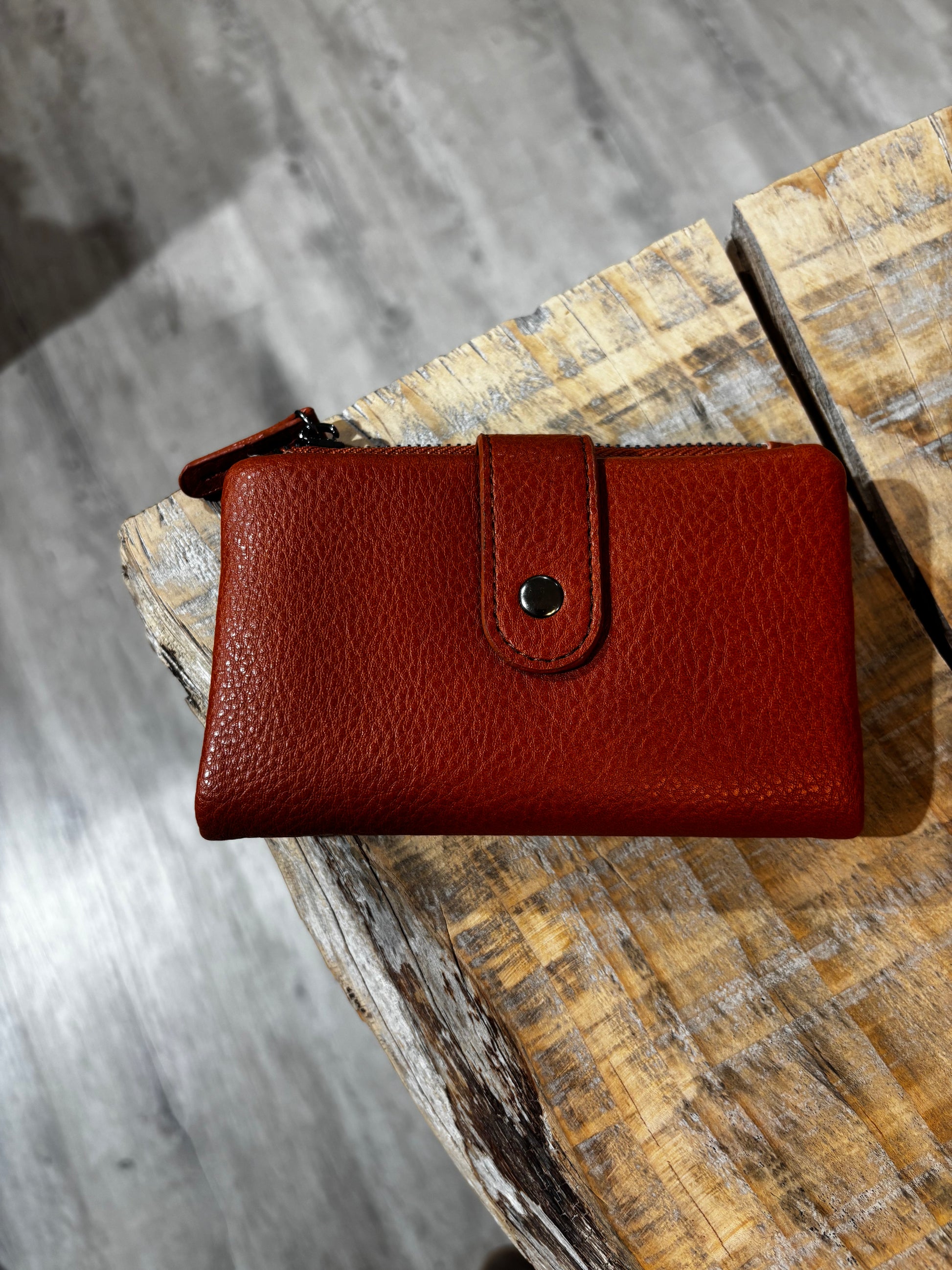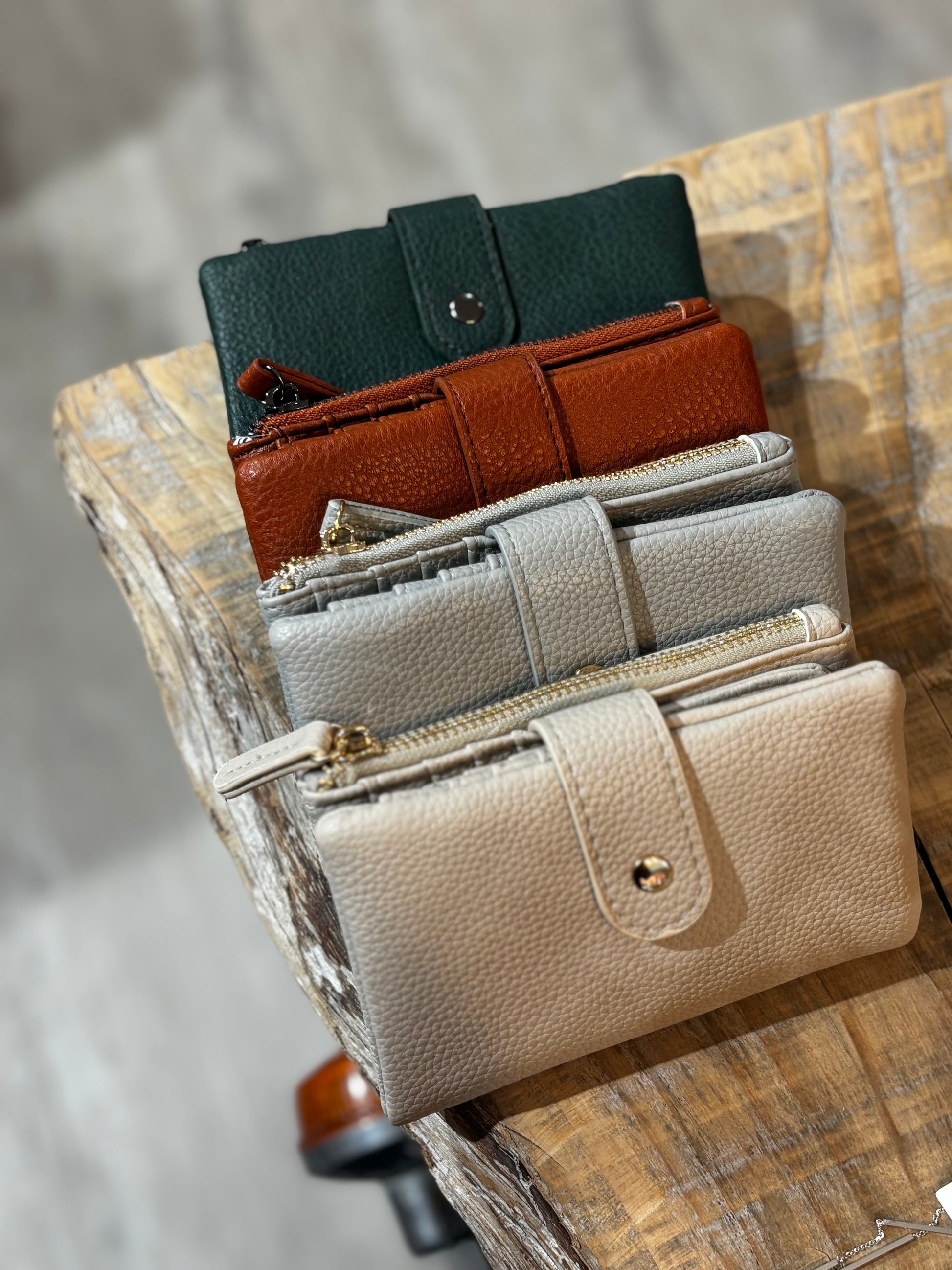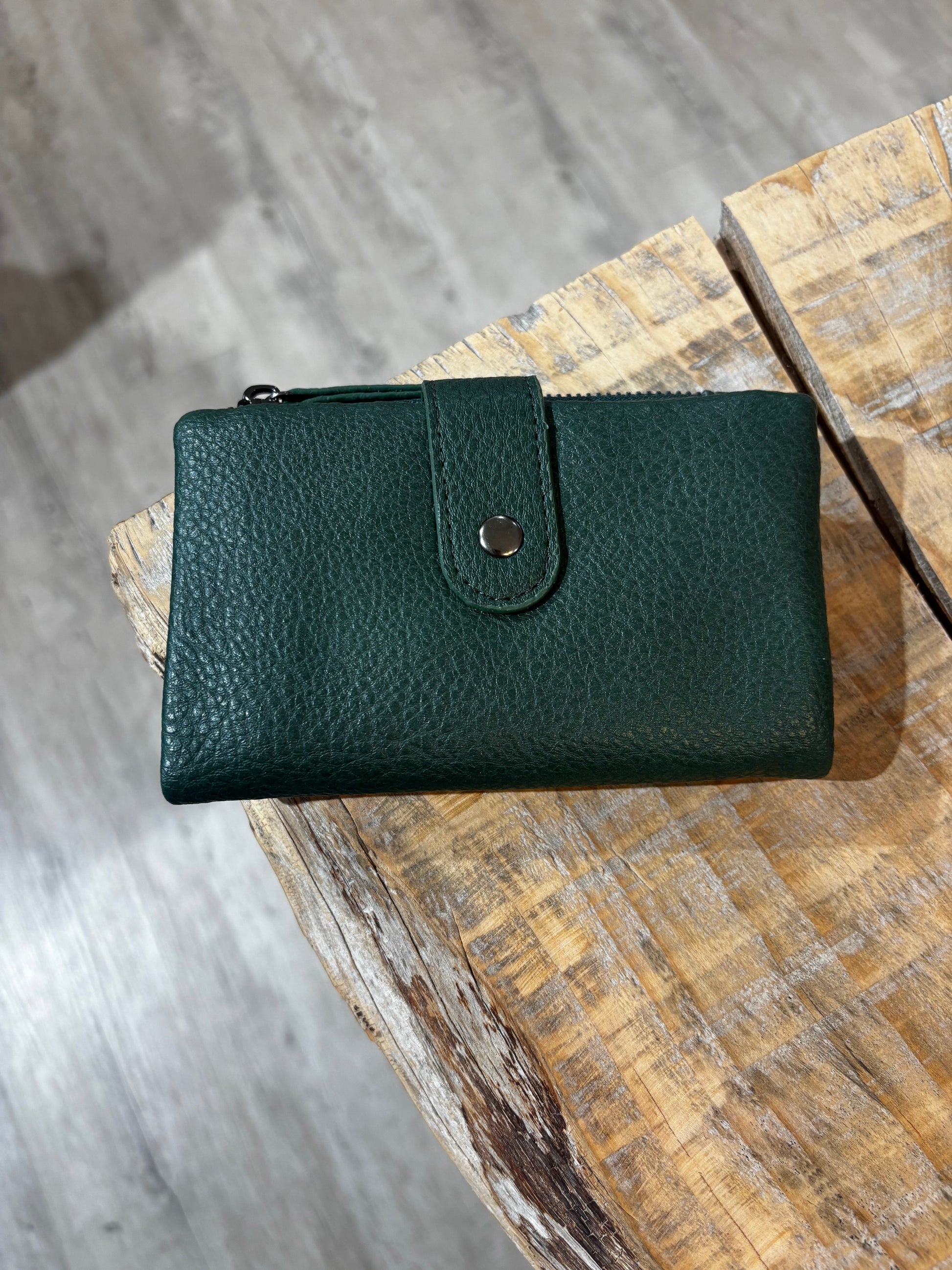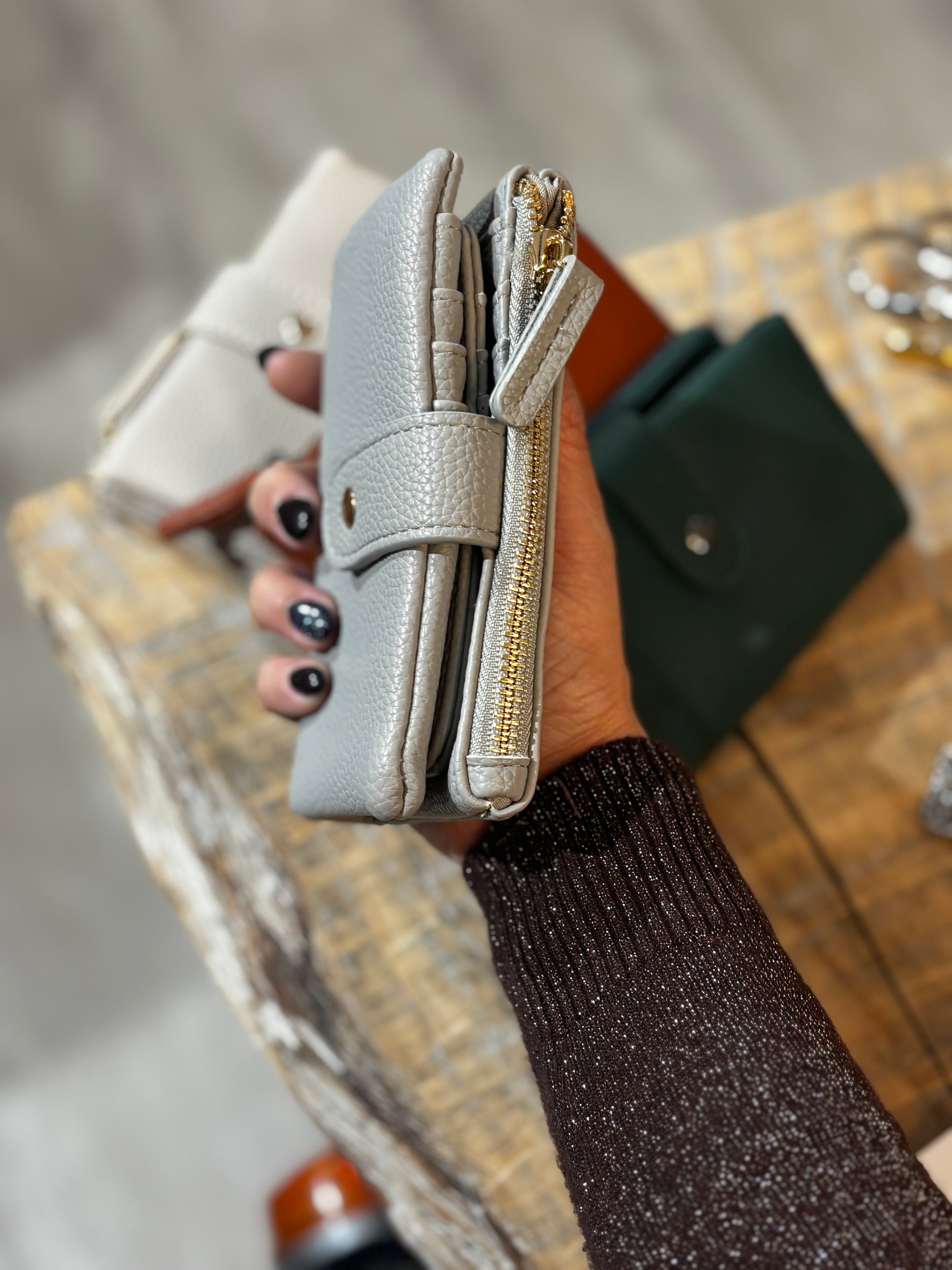 Portafoglio di media misura, con scompartimenti tessere, banconote e zip laterale per la moneta.