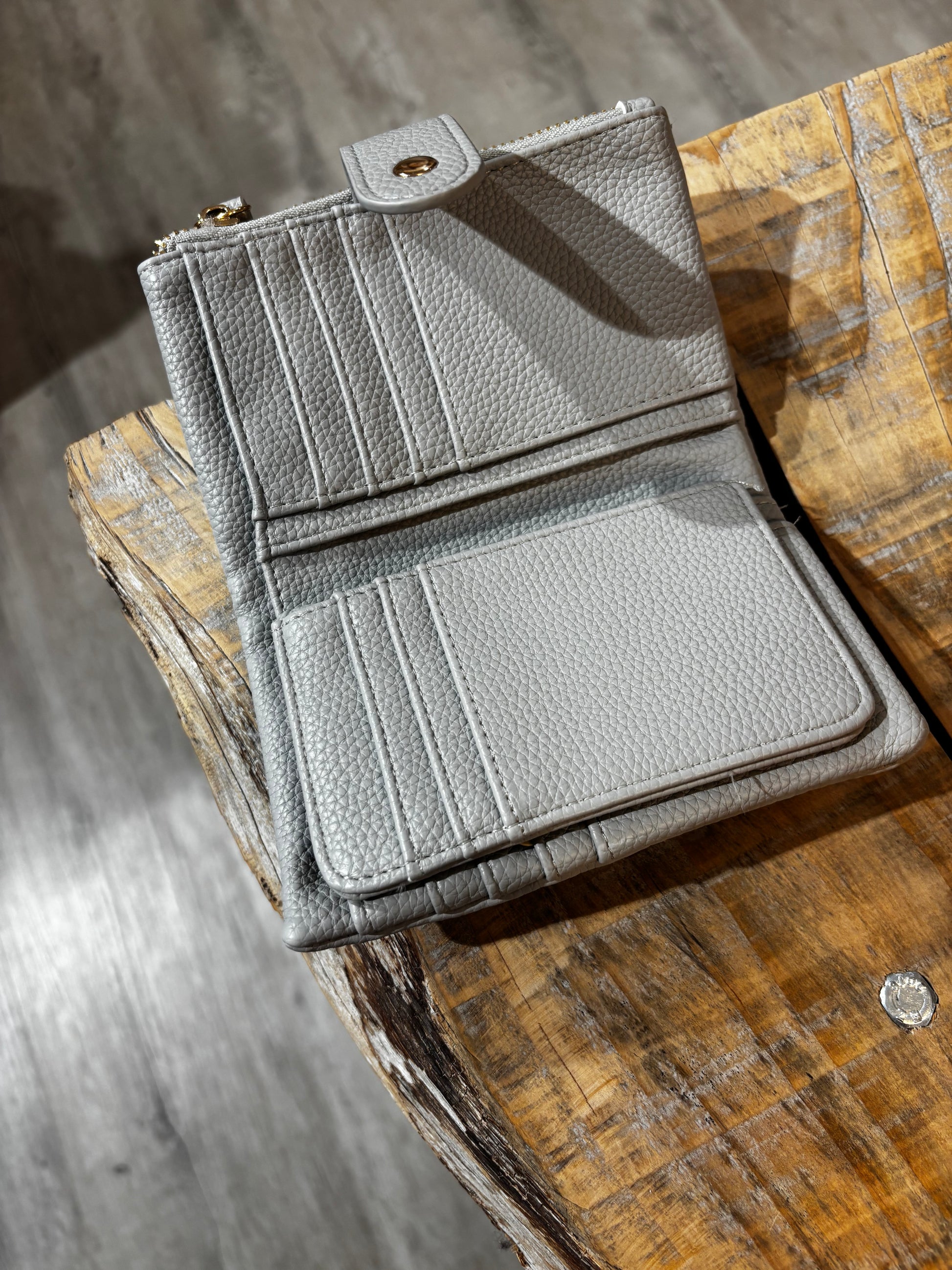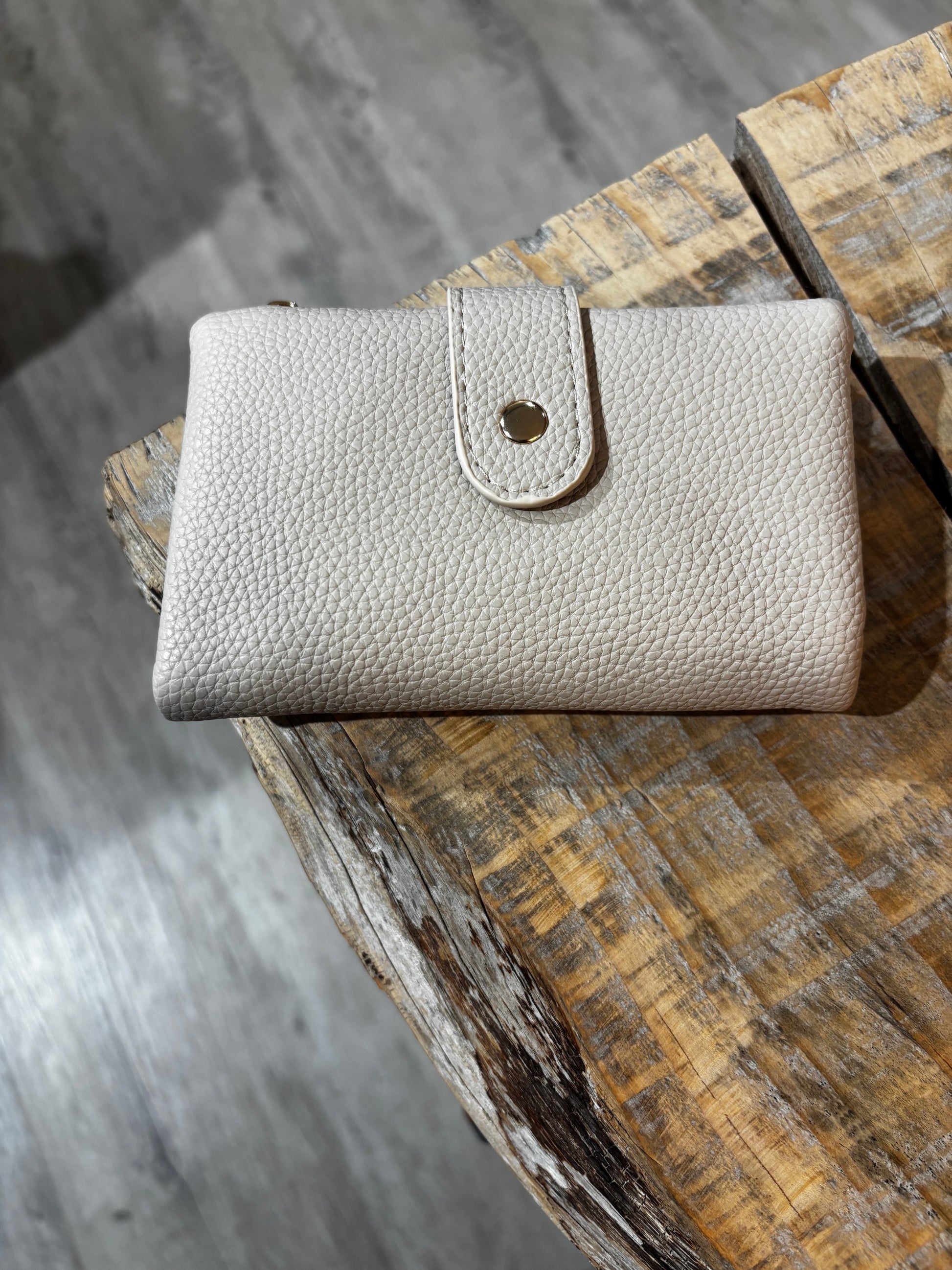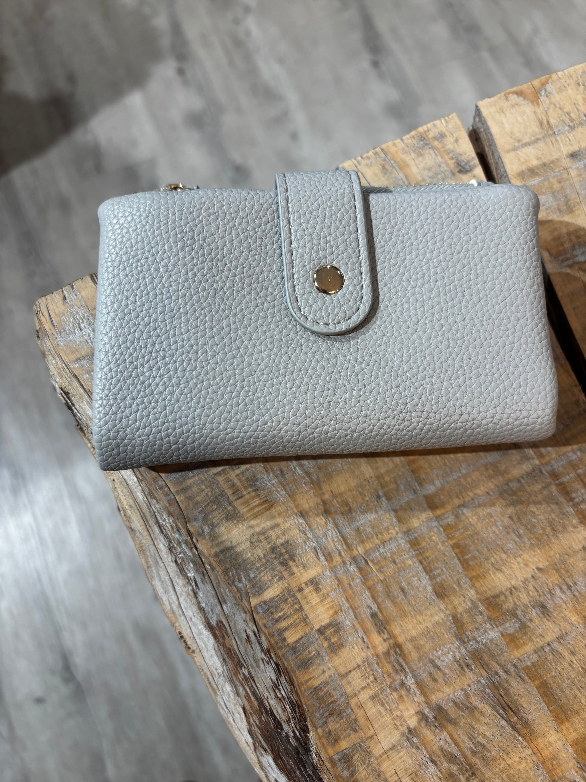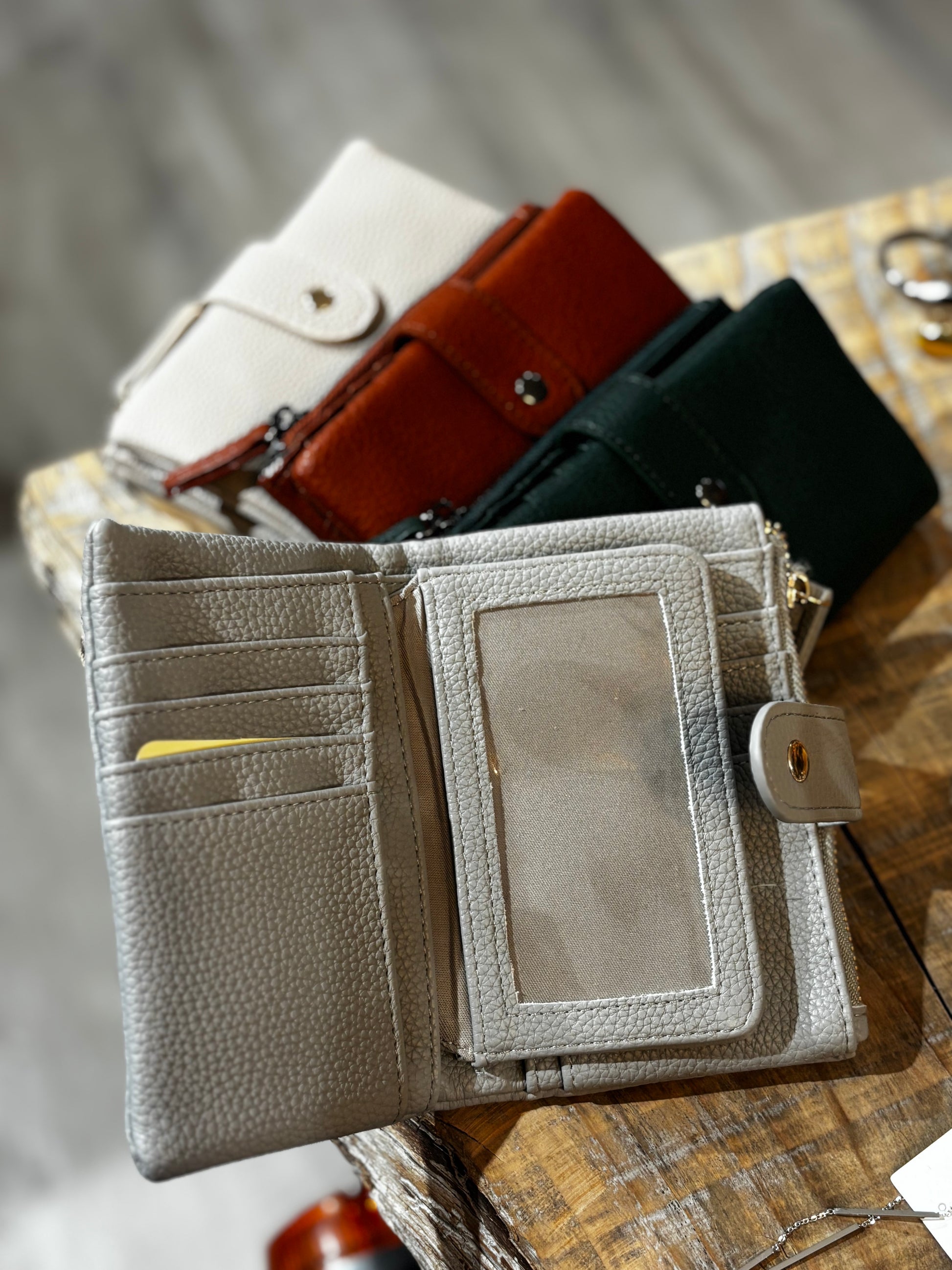 Portafoglio di media misura, con scompartimenti tessere, banconote e zip laterale per la moneta.